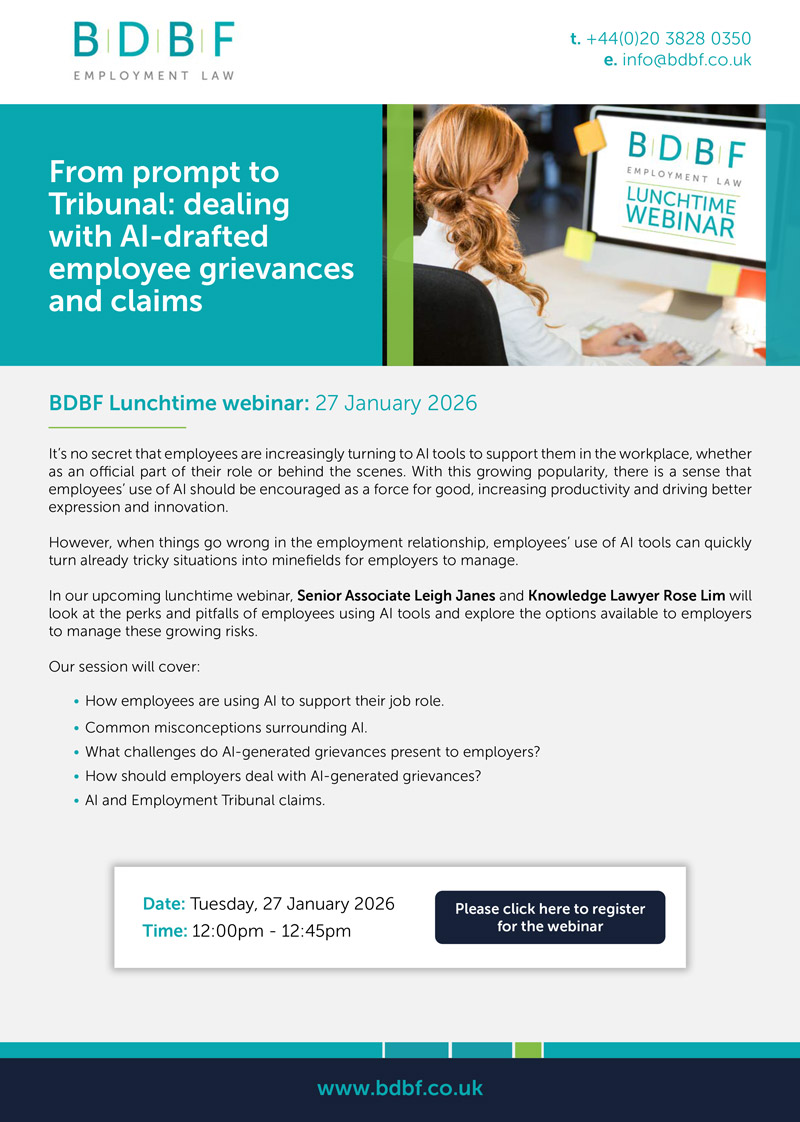 BDBF is a leading employment law firm based at Bank in the City of London. If you would like to discuss any issues relating to the content of this article, please contact Amanda Steadman (AmandaSteadman@bdbf.co.uk), Rose Lim (RoseLim@bdbf.co.uk), or your usual BDBF contact