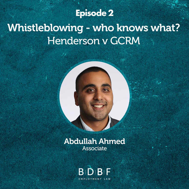 In our latest episode, host Tom McLaughlin is joined by BDBF Associate Abdullah Ahmed to analyse the Employment Appeal Tribunal’s decision in Henderson v GCRM and its implications for whistleblowing protection under the Employment Rights Act 1996. Tom and Abdullah set out the factual background to the case, including the disclosures made by Mr Henderson, the alleged detriments he claimed to have suffered, and the findings of the Employment Tribunal at first instance. They also provide practical advice on the hurdles whistleblowers face (evidentiary/procedural) and best practices for employers managing disclosures.
